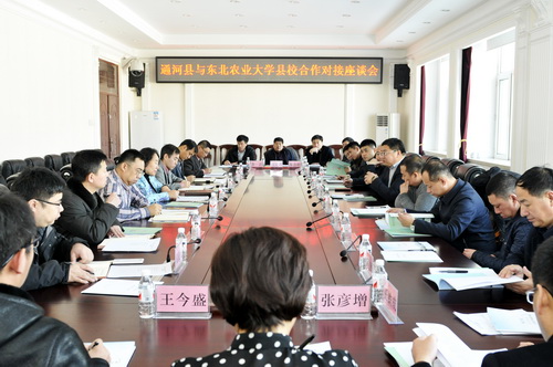 2月14下午,通河县县长曹德友,县委常委刘振兴,副县长吴哈宁、张昕明带领县政府办公室、财政局、农业局、水务局、林业局、发改局、人社局、工信局、经济技术开发区、招商局、水产总站、循环经济办公室和新农村建设办公室等相关部门负责人一行17人来我校就校县合作进行对接洽谈。我校副校长郑秋鹛,新农村发展研究院常务副院长孙占峰、副院长朱志猛、宋珲,哈尔滨市食品产业研究院院长高汉峰、副院长康立功等参加了对接洽谈。座谈会在主楼604会议室举行。会议由孙占峰主持。