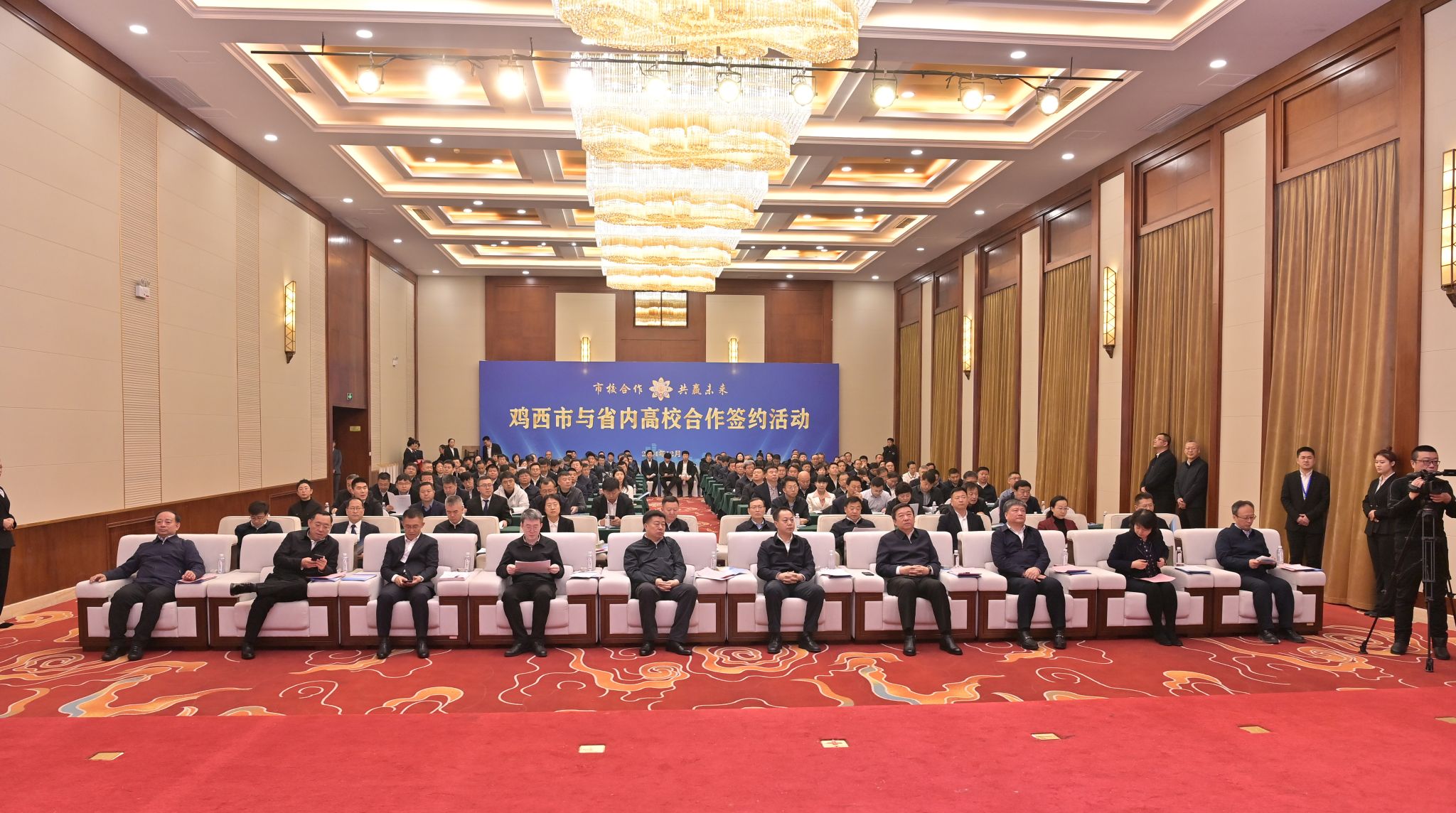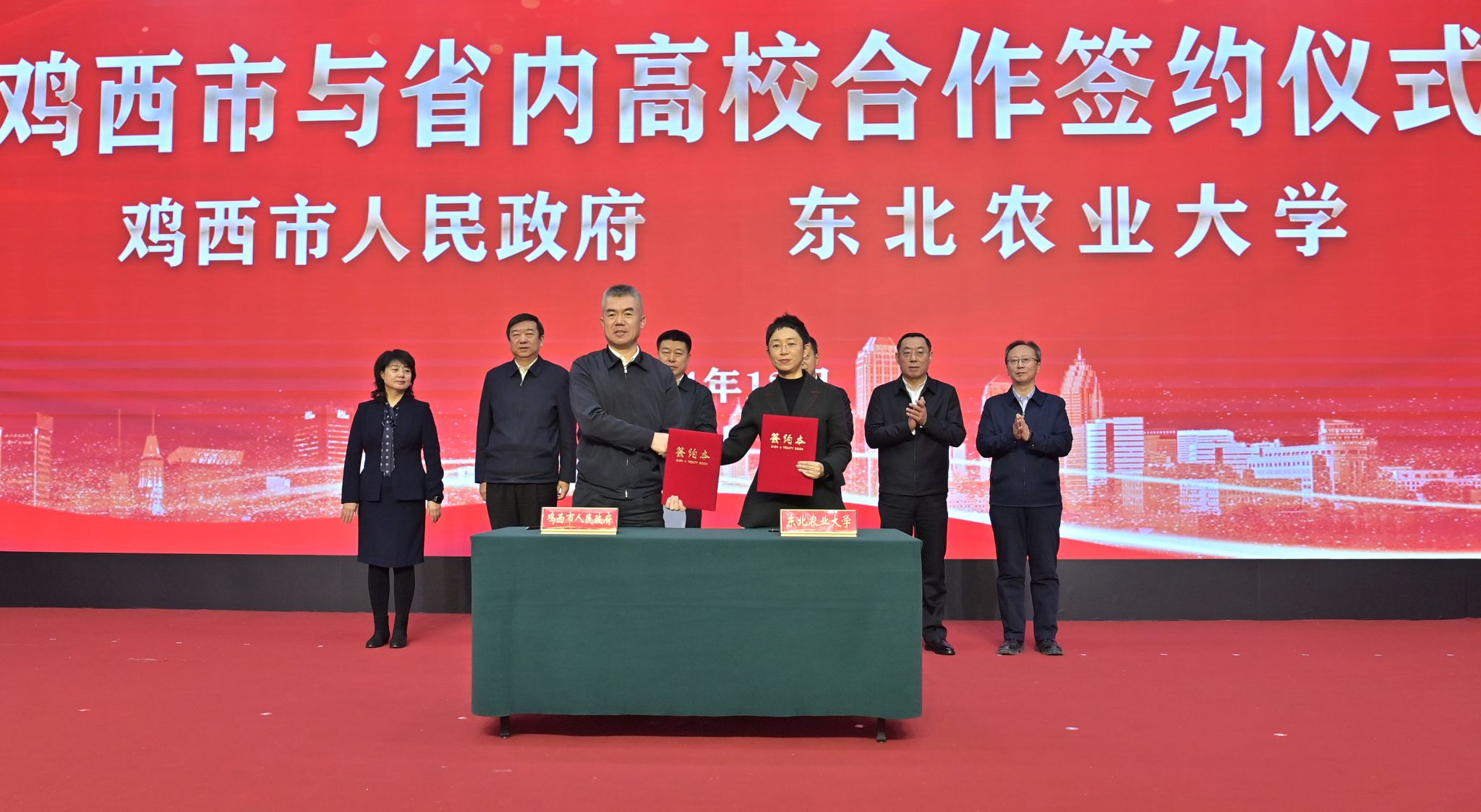 为深入贯彻落实习近平总书记在新时代推动东北全面振兴座谈会上的重要讲话和在视察黑龙江期间重要讲话重要指示精神,围绕“以科技创新引领产业全面振兴”的工作要求,聚焦实施创新驱动发展战略,推动科技创新与产业创新深度融合,加快形成新质生产力,助力高校先进创新成果转化落地鸡西。12月28日,东北农业大学副校长姜毓君、招生就业处处长潘俊波、黑龙江省绿色食品科学研究院副院长杨文敏等一行5人参加鸡西市与省内8所高校共建合作签约仪式。省委教育工委副书记王震,省委组织部有关处室负责同志,省内合作高校相关领导,鸡西市委书记鲁长友,市委副书记、市长孙成坤,市委组织部部长谢喆及市政府相关领导、各县(市)区、市直部门及企业单位相关负责同志等近200人参加签约仪式。谢喆主持签约仪式。