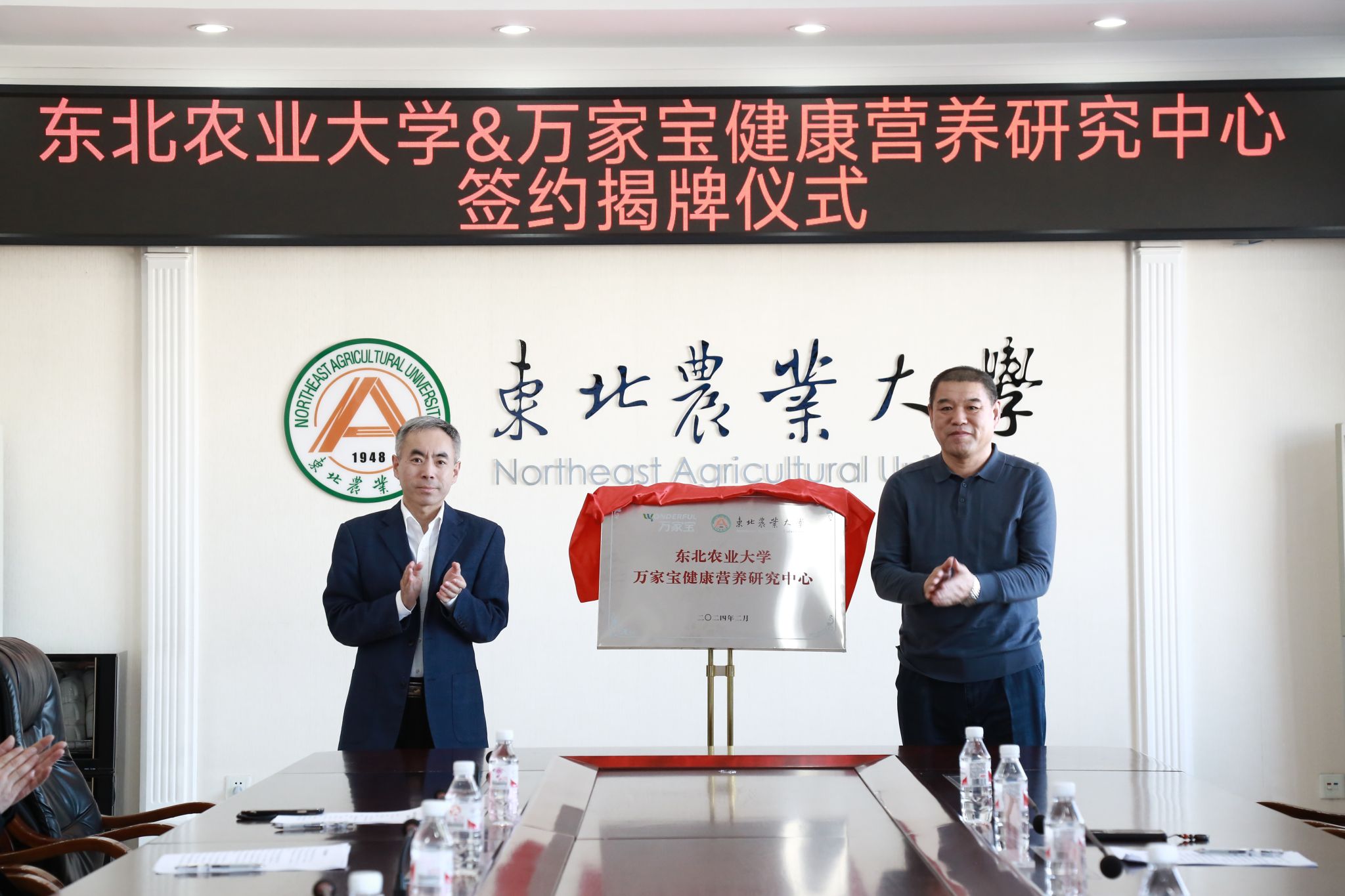 孙占峰、柴宝全分别代表学校及万家宝鲜牛奶集团共同为“东北农业大学&万家宝健康营养研究中心”揭牌。