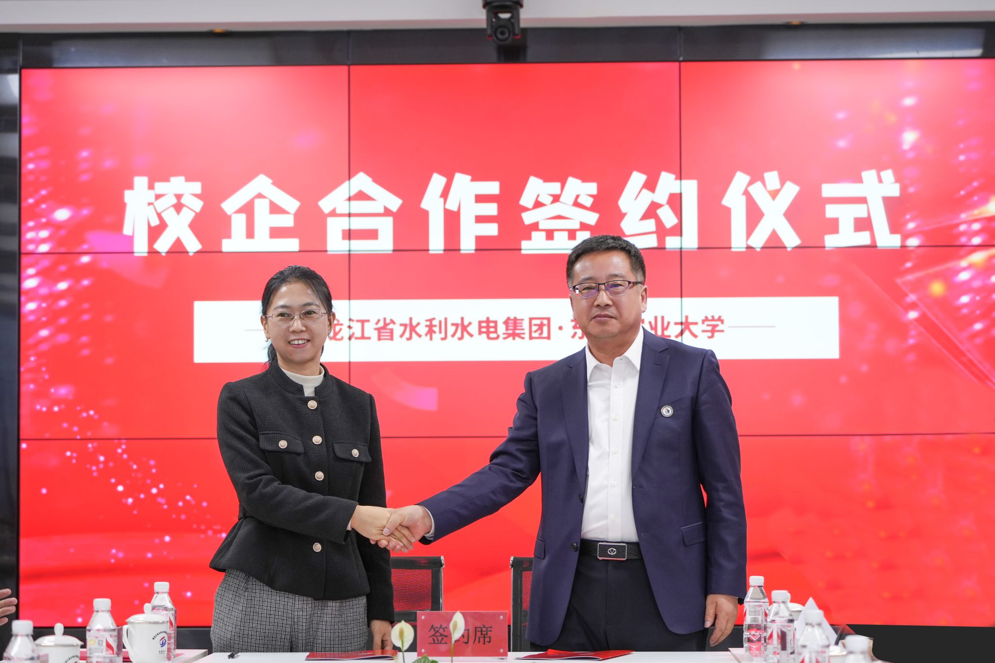 随后,孙占峰与李曜盛共同为校企合作孵化基地揭牌,李茉与黑龙江省水利水电集团有限公司党委副书记、副董事长、总经理曲卫东代表双方签署校企合作协议,黑龙江省水利水电集团有限公司副总经理黄景海为刘继龙和王子龙教授颁发水立方舟实训基地特聘指导专家聘任证书。