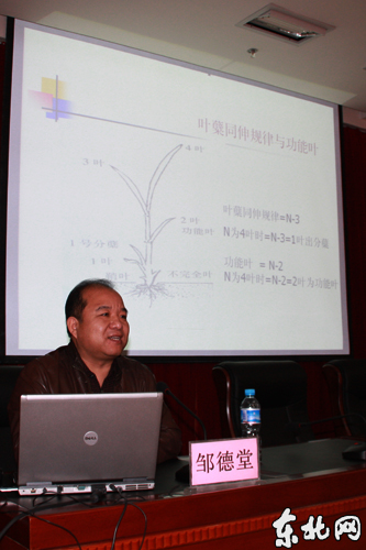 上午9时许,当记者来到东北农业大学新农村发展研究院的7楼会议室内看到,来自学校农学院的邹德堂教授正在为台下的“学生们”讲授水稻高产栽培技术的知识,讲到栽培水稻高产的“高招”时,台下的“学生们”纷纷竖起了耳朵,赶忙记着笔记。