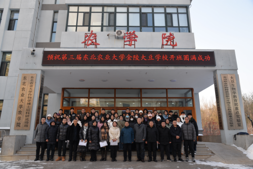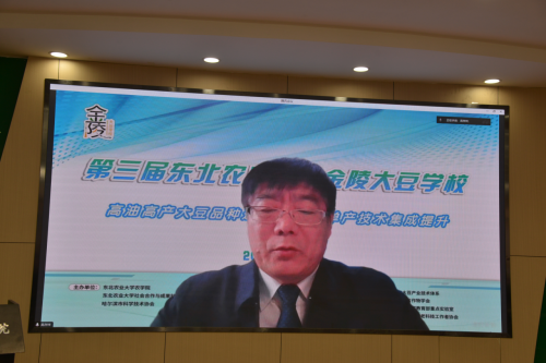 2023年11月26日上午,以“高油高产大豆品种选育、大豆单产技术集成提升”为主题的第三届金陵大豆学校开班式在东北农业大学农学院举行。东北农业大学副校长孙占峰,黑龙江省农业农村厅科教处处长樊丽娜、国家大豆产业技术首席科学家吴存祥研究员、哈尔滨市科学技术协会科普处处长马叶林、农学院党委书记李晓书、院长陈庆山、新农村研究院副院长李其林、农学院副院长张林、教师代表及全体线下学员参加本届开班式。开班式由东北农业大学新农村发展研究院院长朱志猛主持。