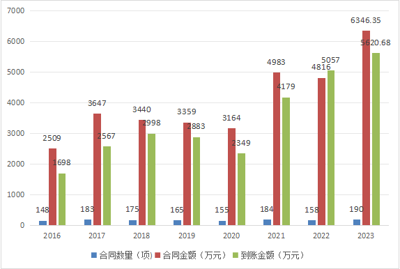 “十三五”以来,学校接受省内外企事业单位、社会团队委托,累计签订技术服务、技术委托开发、技术咨询类横向课题1358项,合同金额32264.35万元,到账金额27351.68万元。总体看,横向课题签订数量变化不明显,合同金额和到账金额呈现波动上升的趋势,尤其是“十四五”以来增加明显,说明横向课题的单项合同金额逐步增大,课题质量也逐步提升。