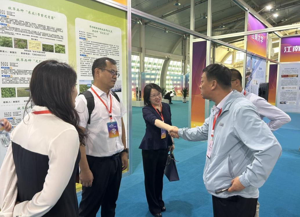 参展期间,内蒙古多家优秀企业来到我校展区了解学校科技成果情况,并就校企合作、成果推广示范、成果转化等工作开展深入交流。其中,内蒙古鲜农农业科技有限公司与我校就番茄育种合作研发、成果推广示范等内容开展深入洽谈,并达成了初步合作意向;内蒙古西蒙种业有限公司对刘珊珊教授研发的“降胆固醇特殊健康用途大豆新品种东农豆358”产生浓厚兴趣,达成了初步合作意向;内蒙古富康荣盛管业有限责任公司就李凤兰教授研究的“低温秸秆腐熟菌剂开发及寒地农业废弃物综合利用技术”进行深度交流,围绕秸秆造纸、植物地膜等方向达成初步合作意向。巴彦淖尔市科技成果转化中心主任刘庆元来到我校展位,就深入推进双方校地合作、成果推广示范、成果转化等工作与我校进行了对接交流。