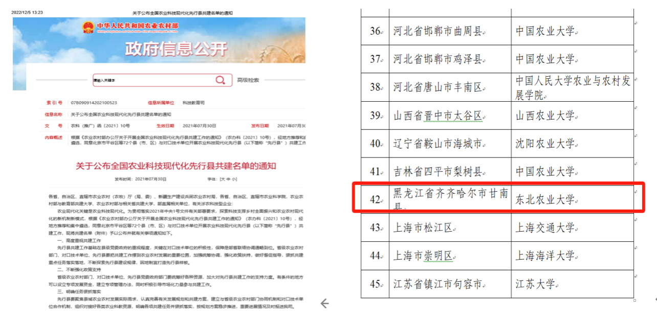 2021年7月,东北农业大学支持甘南县获批“全国农业科技现代化先行县”建设。双方党委主要领导靠前指挥,通过成立工作专班、聘请首席专家、开展支部一帮一活动、组建技术服务团队、率先开展理论研究,统筹推进先行县各项工作。